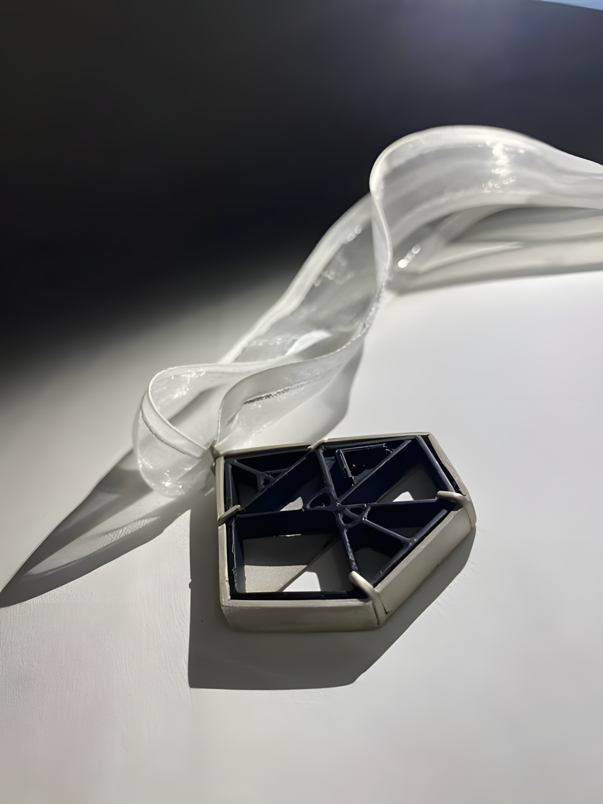 The resin cast is not completely solid and features negatives spaces. This allows for portions of the silver metal to be visible when looking at the medal from the front. This can be seen in the example drawing above where the darker shaded areas represent the metal that is visible. The setting its self also has negative space with two upsides down triangles pierced out this again can be seen as the pure white triangles on the example triangle. The use of negative space through out the medal is designed to create a sense of depth. The overall design and manufacture of the medal is structured in a way to represent techniques that are associated with fine jewellery as well as contemporary jewellery where there is freedom to be experimental hence the use of resin casting which gives the medal a balanced feel of luxury and artistry.